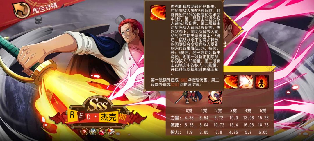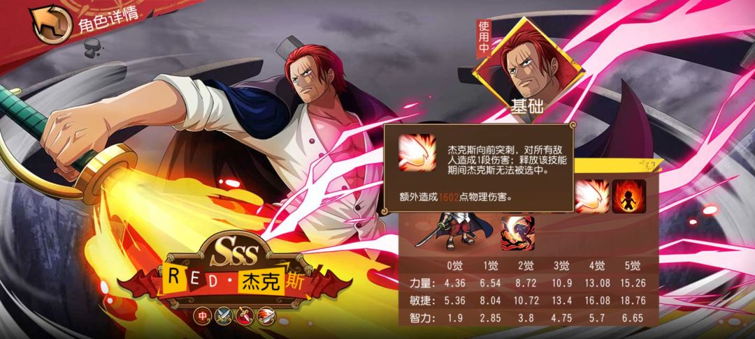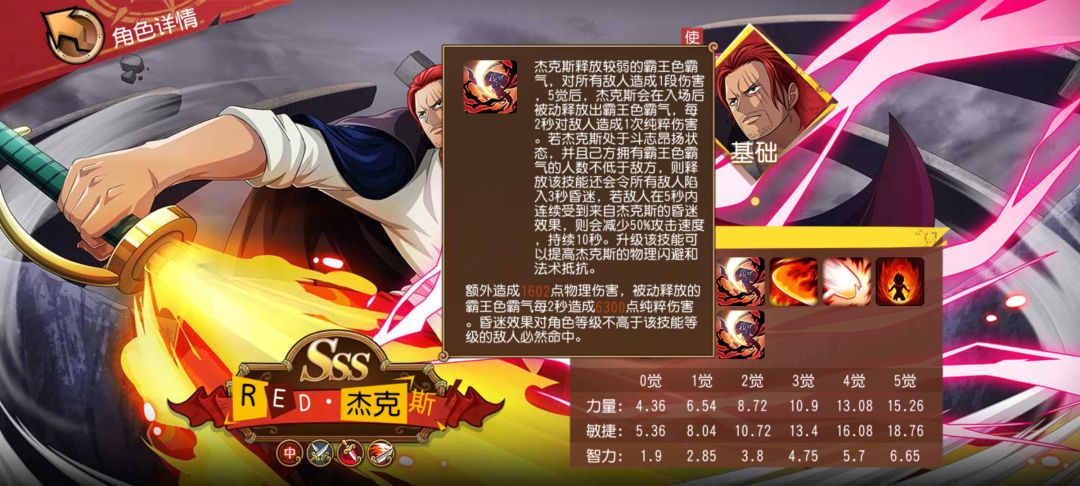 给大家的面子:在触发了斗志昂扬状态后,RED·杰克斯受到的物理和法术伤害降低50%,这是目前版本一线人物的标配设定;若己方拥有霸王色霸气的人数不低于敌方,除了会事大招具备昏迷效果外,还会降低30%全体受到的伤害。