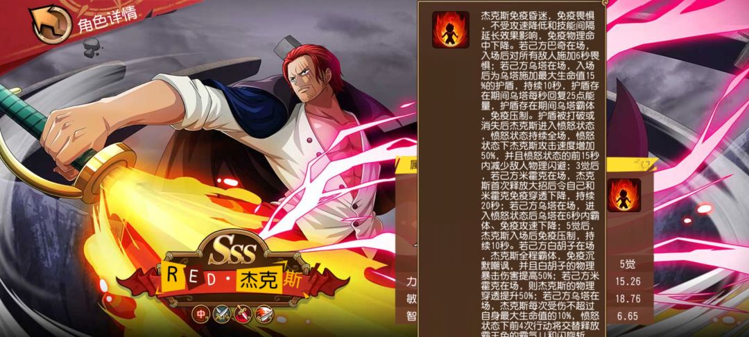 在这个字数多达554个的小作文级别的技能设定当中,策划不仅主动玩起了“面子梗”,也确实给足了RED·杰克斯的面子:技能效果多到应接不暇、眼花缭乱。值得一提的是,和该技能联动的角色也是原作中和杰克斯有极强联系的几名角色,既有“海盗王练习生二人组”巴奇和杰克斯,也有“剑术交流会会长”大剑豪·米霍克,再加上“旧时代的象征”白胡子和“新纪元的开创者”RED·乌塔,搭建出了这样一支内含“红发”杰克斯冒险故事缩影的队伍,笔者在震惊之余不禁会心一笑——策划还是懂《航海王》的!
