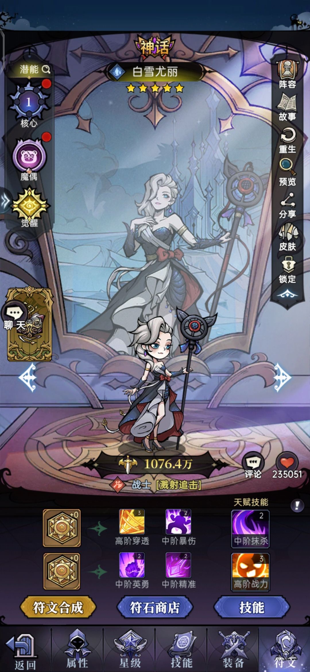 这个时期,我吃着火锅氪着金玩着白雪物语突然就被吊打,气呀!我一个危8大佬被吊打,充的钱被狗吃了是吧?然后就开始研究了,这叫往细的方面玩,当一个有脑有金的大佬!开始了解符文,搭配符文,符文很重要!这时候白雪卷的特别厉害,四保一白雪被庇护克制,出现了不带物连爆率的秒杀流,那时候白雪就是神!高跟鞋踩着你像看垃圾一样看着你!?简直就是亲女儿,策划一看不行啊,都玩白雪我怎么赚钱?听说是砍了爆率什么的,变的特别吃符文,可以是性价比很低。跌落神坛!所以我放在仓库很长一段时间,放久了果断拆了玩白马![[嗒啦啦_拜拜]]()