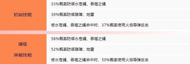 不倒翁宝宝对于水苍蝇、吞噬之蝇、路障、地雷有着出色的防御能力,而一旦被水苍蝇、吞噬之蝇命中时,还有着不俗的反击能力,满级突破后的不倒翁宝宝在被水苍蝇、吞噬之蝇命中时有着高达50%的概率直接使用火焰导弹反击敌人,将攻防一体贯彻到底!