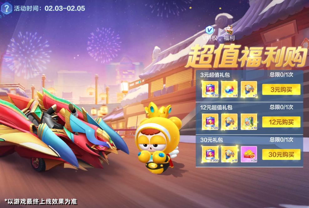 2月3日-2月5日,福利站将限时开启【超值福利购】活动,活动期间可直购超值礼包,支付成功后可立即获得不同档位电池、星愿结晶、炽金启动器、宝宝礼物盒等对应礼包奖励。直购金额自动计入V积分,并支持激活招财猫和进宝猫。