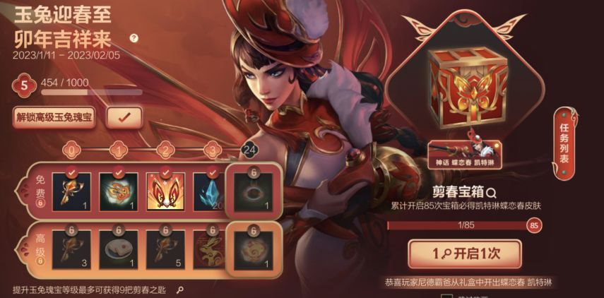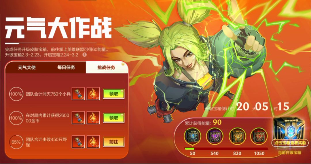 (1)在2月3日-2月23日期间可在游戏内通过领取元气大使能量,完成每日任务,以及挑战任务获取宝箱能量,获取的能量将自动升级皮肤宝箱。