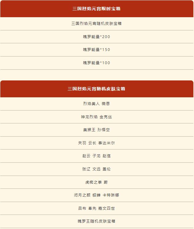 如果召唤师已拥有全部纷争国度系列皮肤(三国)和神龙烈焰系列皮肤,再次开启三国烈焰元宵随机皮肤宝箱,将必定获得魄罗王随机皮肤宝箱。三国烈焰元宵限时宝箱奖励内容如下: