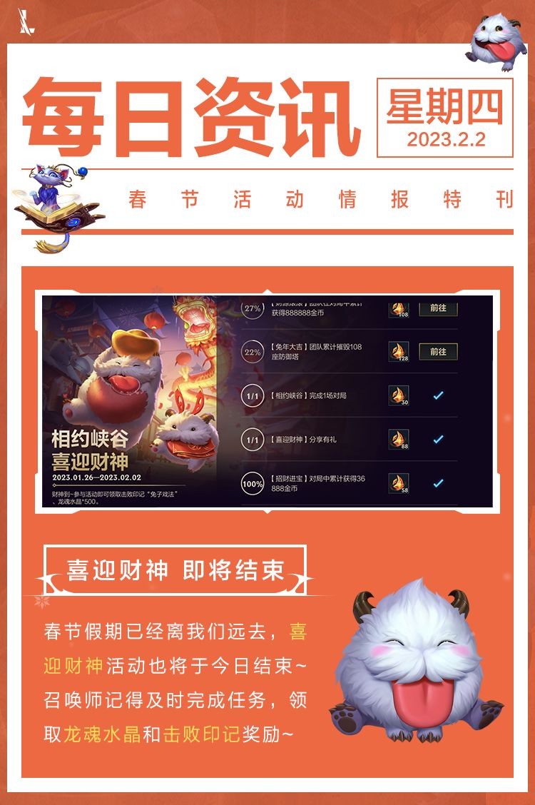 游戏内的飞灯祝愿 开工大吉、相约峡谷 喜迎财神、玉兔齐聚 祥瑞峡谷等活动,也都进入了最后的倒计时阶段。召唤师记得及时完成任务,领取丰厚的活动奖励!
