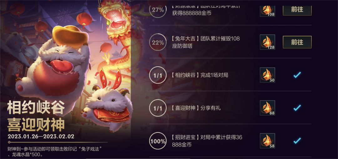 俗话说“天下无不散之筵席”,新春活动将陆续进入倒计时阶段啦~快随隆哥一起盘点一下,看看召唤师有没有遗漏的奖励没有领取吧。