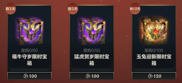 福牛守岁限时宝箱和猛虎贺岁限时宝箱仅剩最后3天!想要一次性收获全部春节皮肤的召唤师可要抓紧时间了~错过这一次,也许就要再等一年啦。