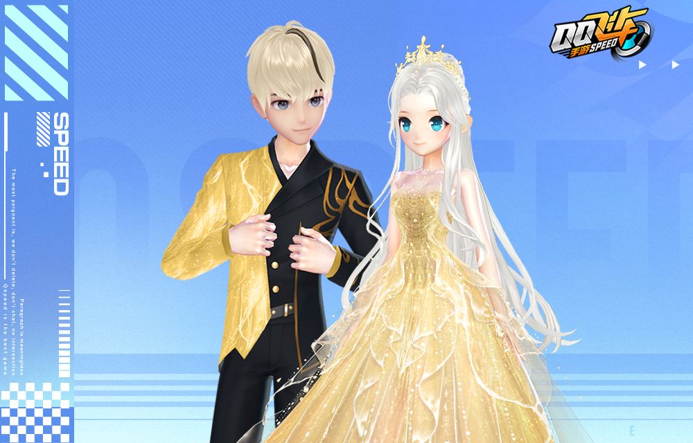 女生银白色长发,一袭金色长裙高贵非凡,周身散发的金色光芒看起来耀眼夺目;男生似海中王子登场,自带水花特效,金色与黑色拼接西装相互衬托,典雅不失风度。