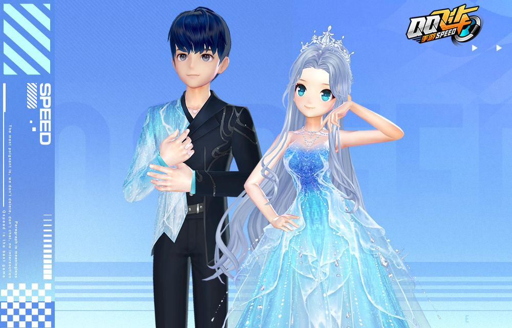 女生水波纹蓝色长裙,如水般荡漾,点缀华丽亮片,闪耀温润明媚的光芒;男生蓝黑色短发,穿着修身的蓝黑色西装,透露着高贵与稳重。