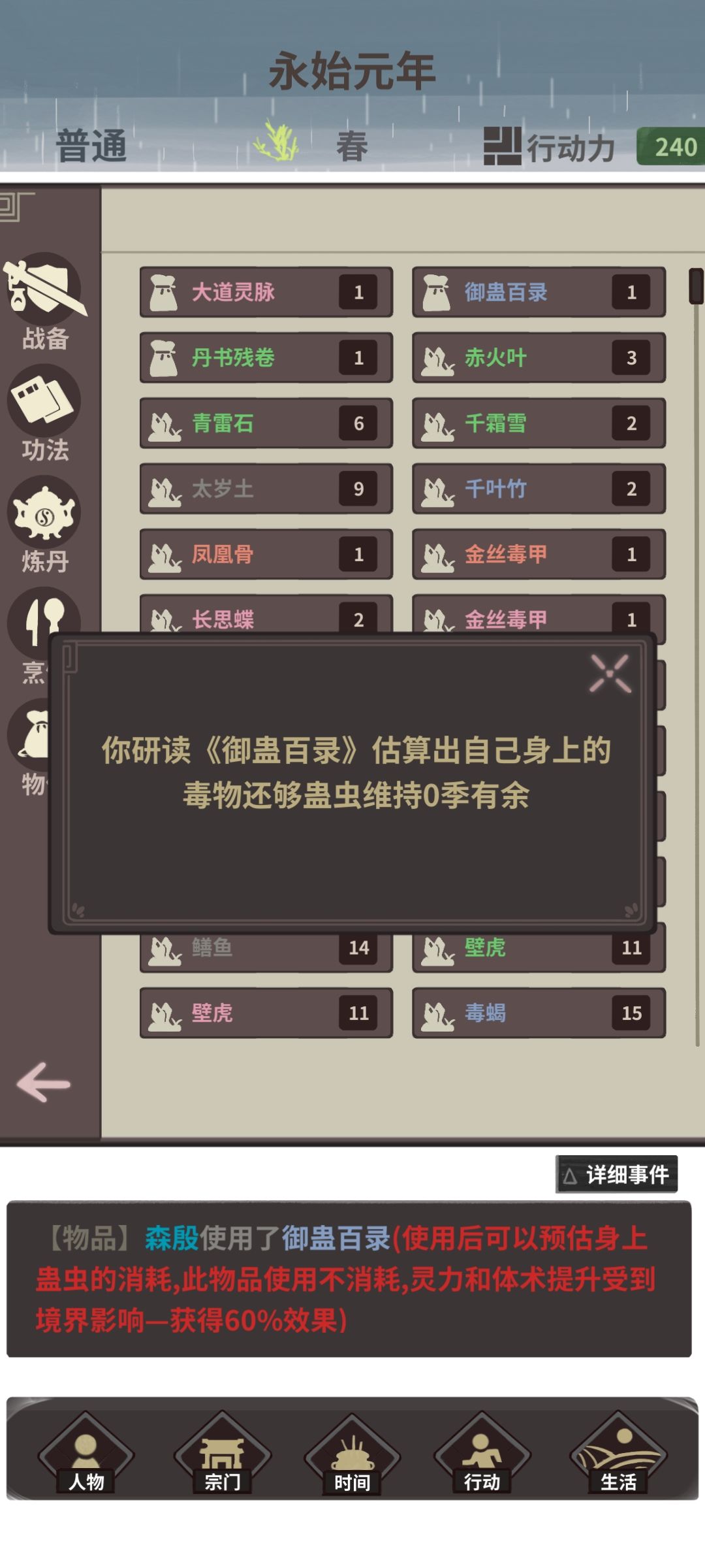 当蛊虫生效时可以与其他npc交互将蛊虫送出。全部送出后使用 御蛊百录 可发现系统已判断无蛊虫,但是蛊虫仍然生效。(存档重启游戏后情况不变)