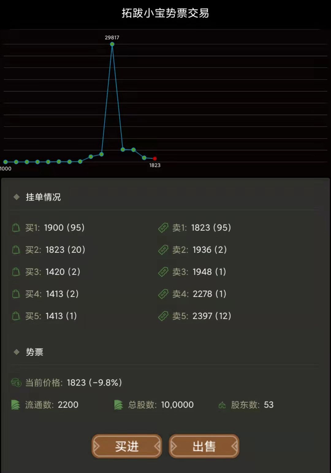 这个势力的玩家很争气,不久之后就发育很好,攻下几座小城,势要剑指中原的意思了。这势头让很多人看到了,便开始慢慢地购买这个势力的势票,这个时间股价开始慢慢抬升。势力的初始玩家可以出售一点原始股,获得大量金钱的补充(这时,势票的融资功能就已实现)。