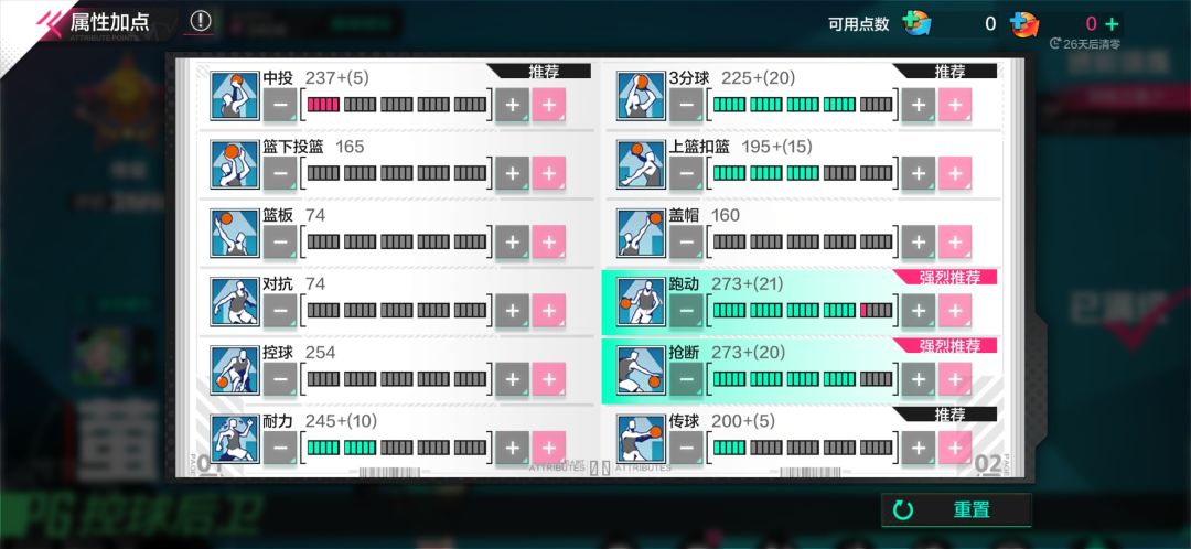 红点拉满跑动抢断后,耐力>中投>盖帽>对抗