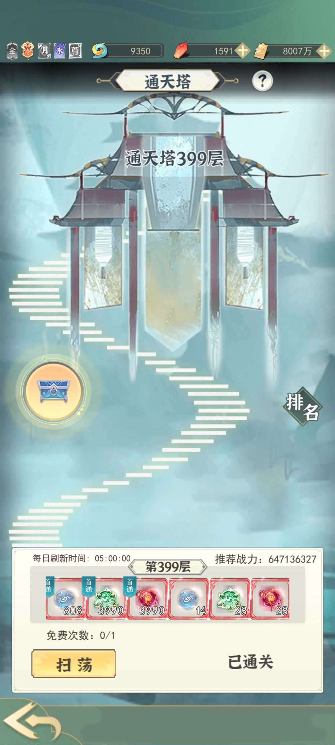 通天塔有一个扫荡卷,当上仙界后可以在活动奖励兑换处兑换,在通关以后再进行扫荡,爬塔携带的天赋技能参考爬锁妖塔和深渊,记得每天进行爬塔(很重要),这关系仙界一个巨大的加成