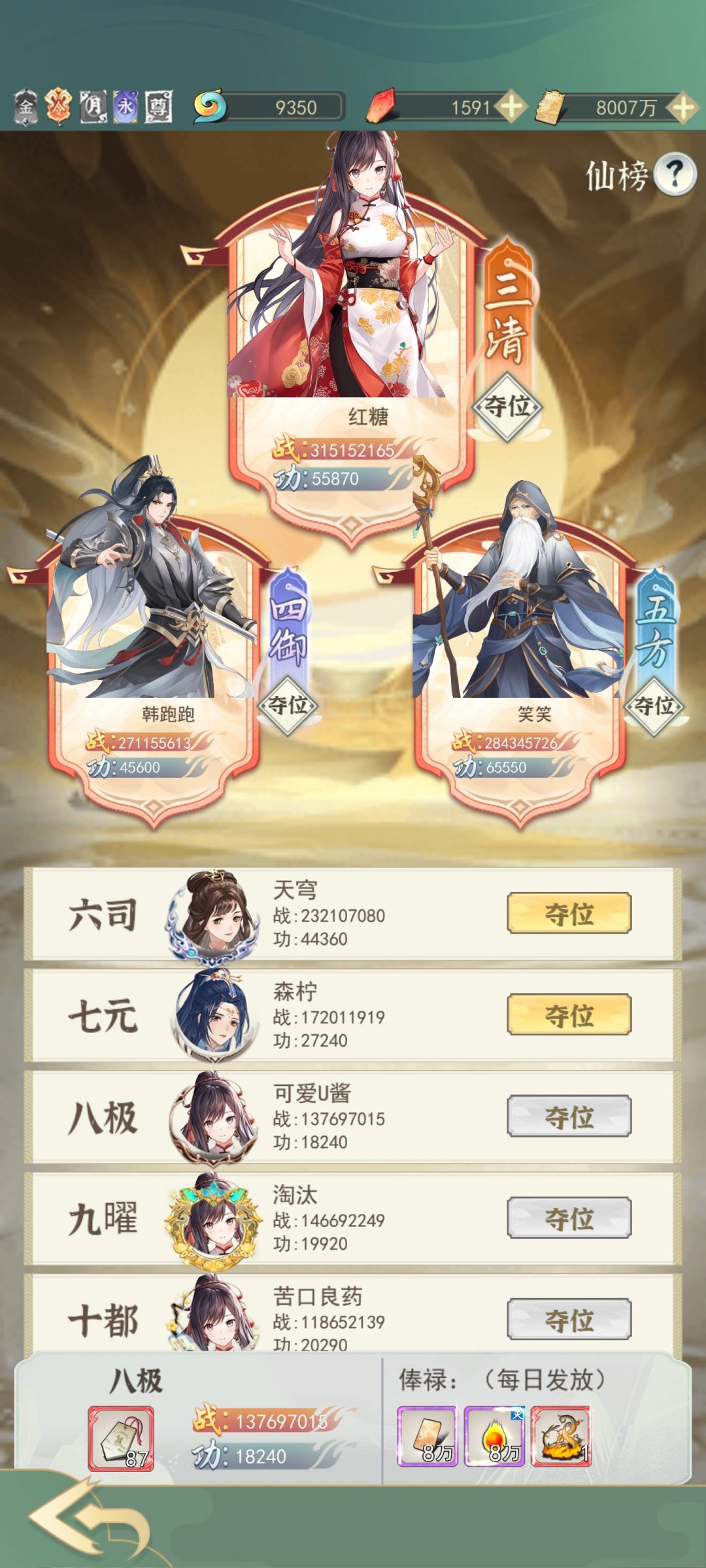 仙榜是一个类似排行榜抢位置的玩法,论坛也有其他介绍帖子,主要加成是修为和鸿蒙紫气,以及发放每日的万能碎片俸禄(一点点)。谁强谁上位。