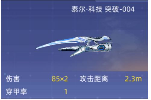 泰尔-突破-004 :泰尔科技公司打造的全新变形神器!赋予赋予使用者冲锋陷阵的勇气,突破敌方阵线!伤害:85x2、暴击伤害:100x2、对四肢的伤害:70x2、攻击距离:2.3m、穿甲率:1、刀速:85、跑速:1可以瞬间造成两段伤害,加上百分百的穿甲率,击中基本可以宣告敌人的死亡了,爆头可以造成200的高额伤害非常离谱!