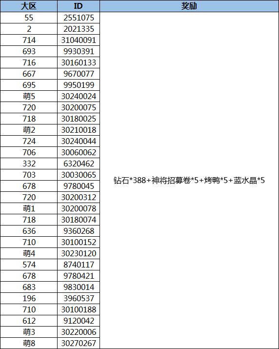 钻石*388+神将招募卷*5+烤鸭*5+蓝水晶*5*30份