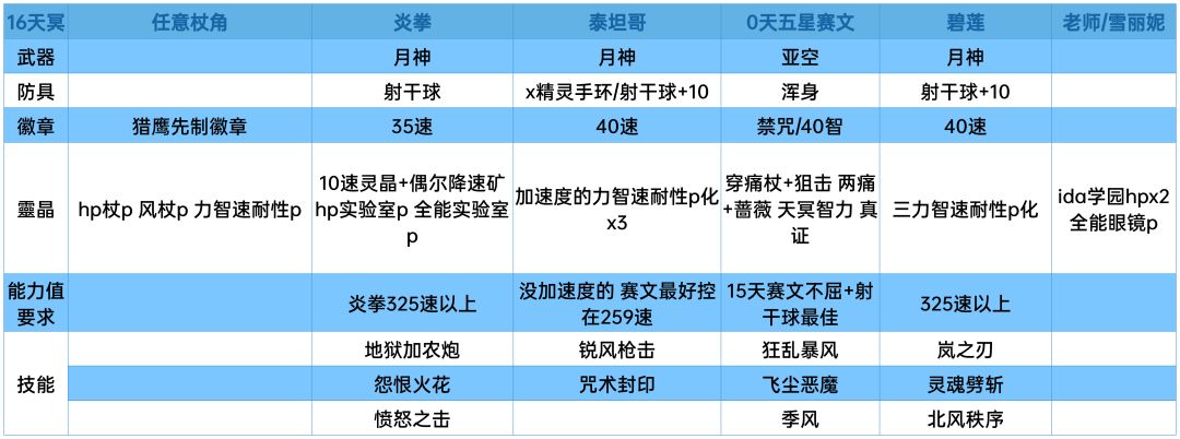 ②es月华/会长+泰坦妹带猎鹰用水之神+紫枪/as乙叶+三下降+灵晶架即可