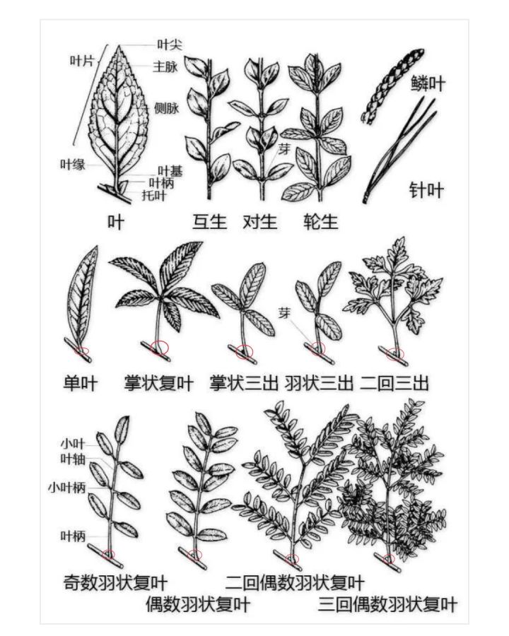 有的叶芽会长出很多叶子,这【很多叶子】一般被称之为【一个完整叶】的【小叶】——此为复叶。