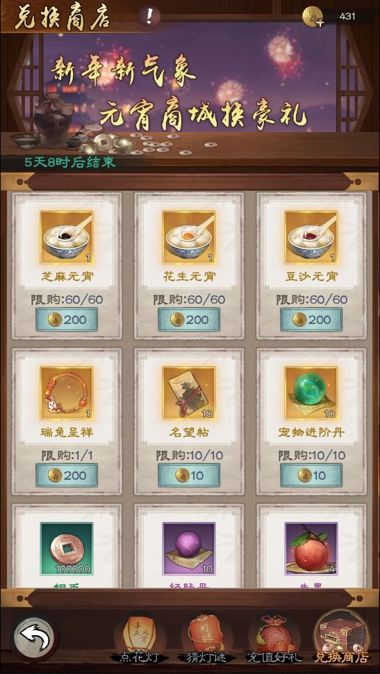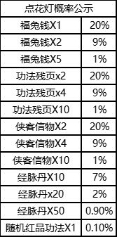 活动期间消耗花灯即可参与点花灯活动,每次点灯都会随机获得一份奖品,有概率获得福兔钱(可在积分商店兑换相应道具)、功法残页、信物、经脉丹、红色功法哦~