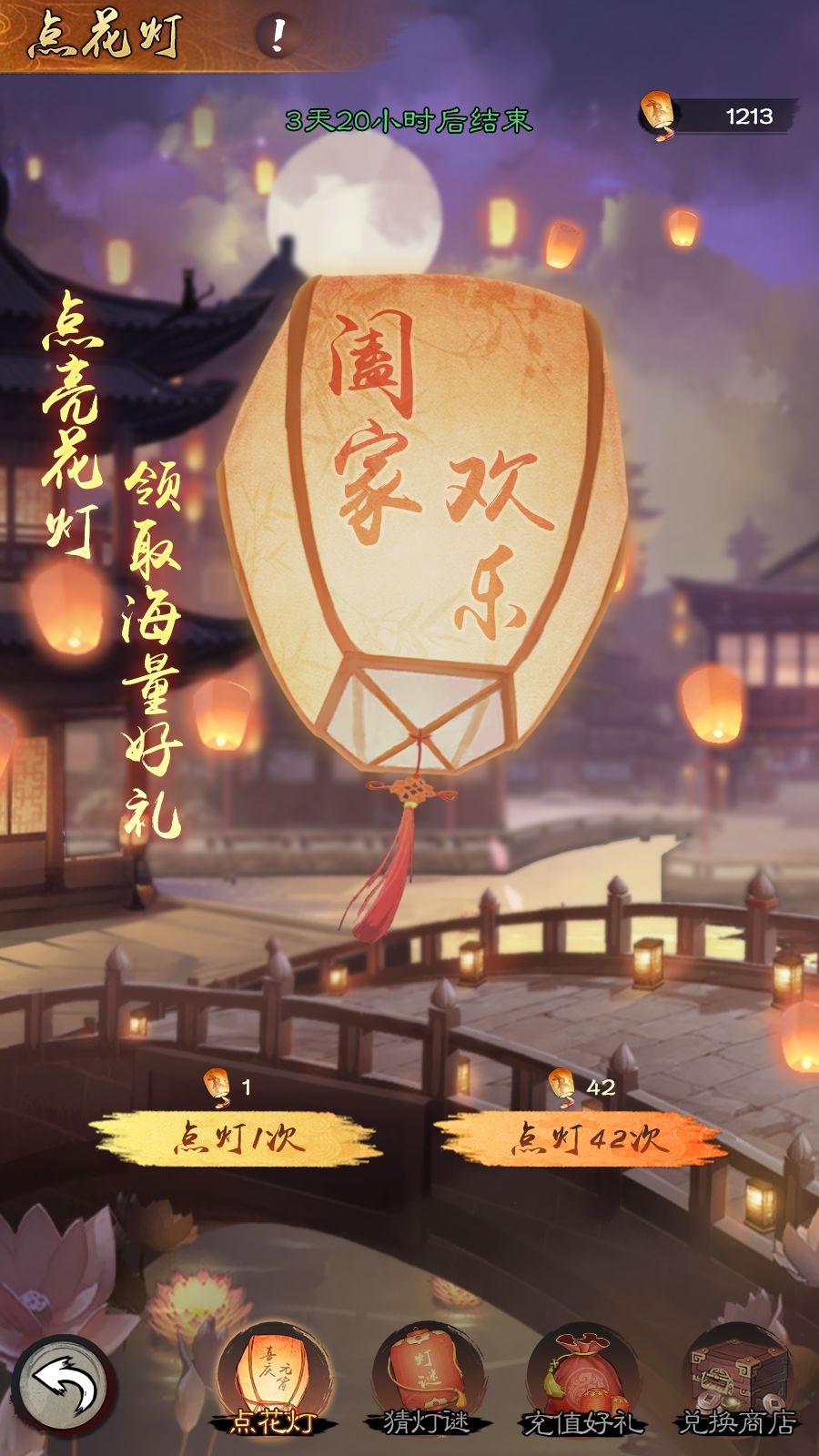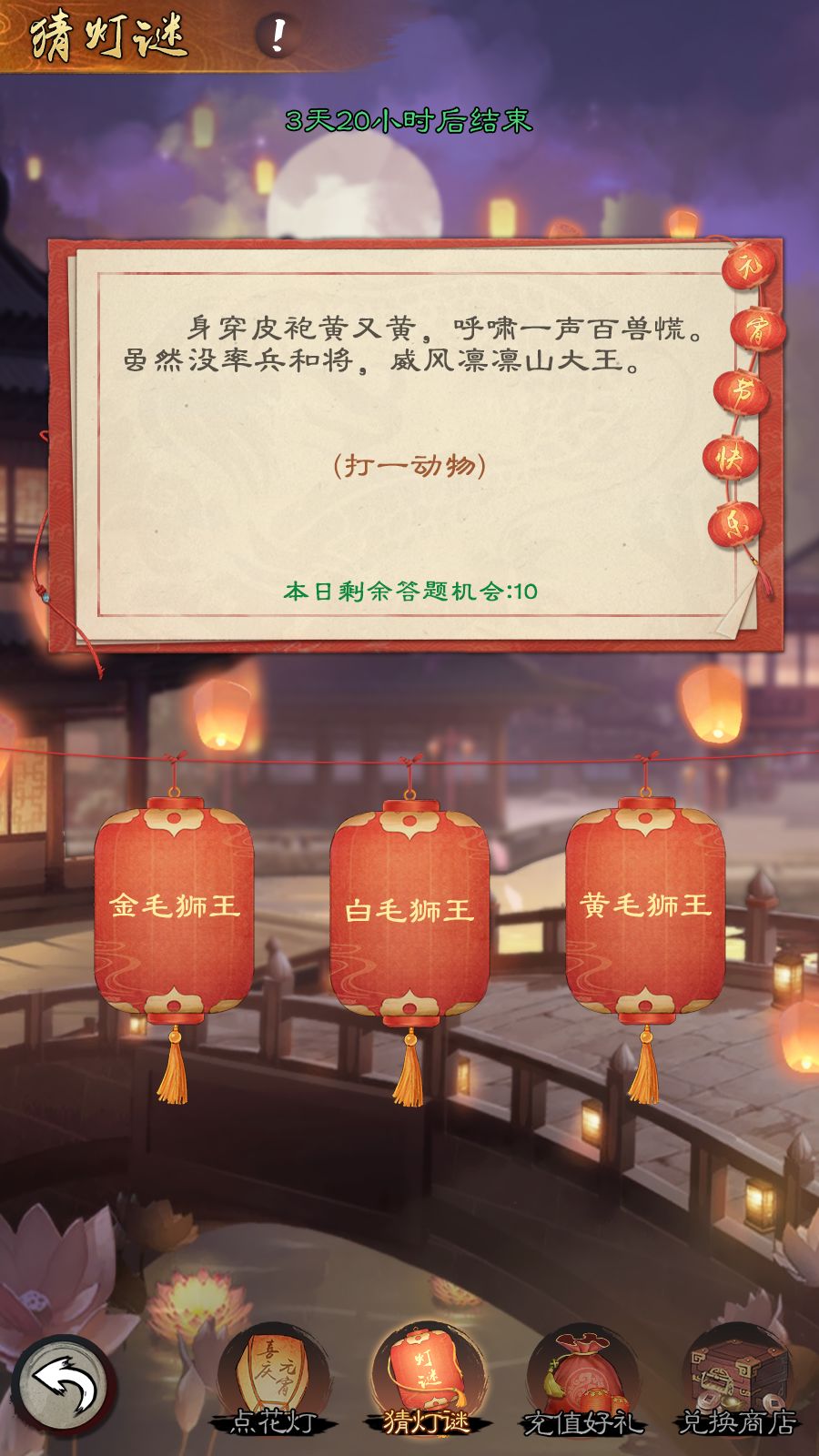 活动期间少主们每天可参与10次猜灯谜活动,无论猜对还是猜错都能获得对应奖励,猜中有概率能获得灯笼(点花灯活动的道具)。