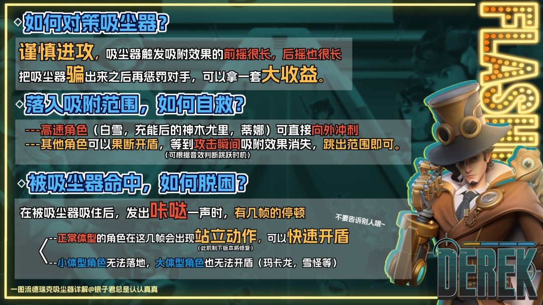 所以,只要故意让吸尘器吸到自己,再卡时机开盾抵挡攻击,就可以贴脸惩罚德瑞克的后摇,非常好用。