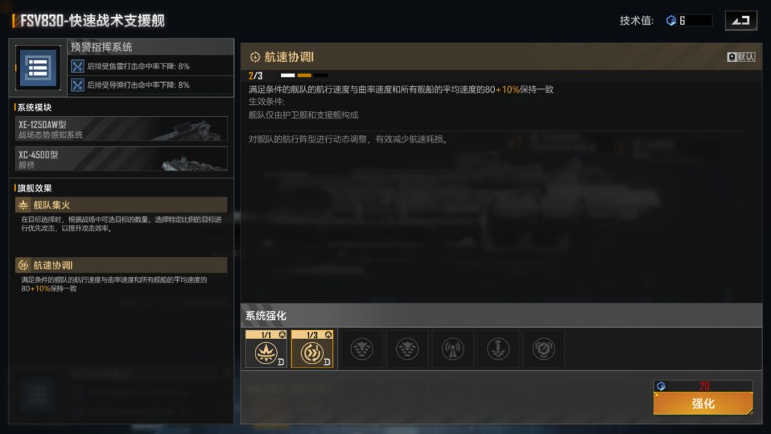 部分舰船蓝图的系统强化项将会获得额外升级功能,舰船的指挥系统将会添加可强化次数,同时添加包括旗舰技能在内的新强化项。通过向蓝图内投入技术值,可以为舰船解锁对应的旗舰技能,并且投入技术值,舰船的结构值也会得到提升,别看量小,放到结构值几十万的航母上时,哪怕10%的提升都是三万结构值的区别。