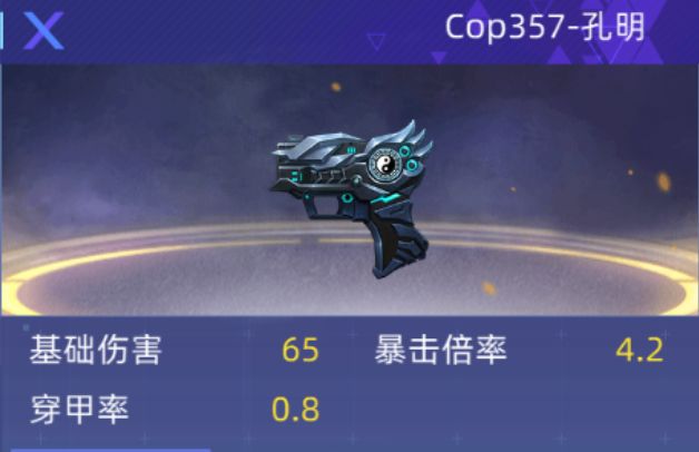 Cop357-孔明:三国孔明降临于全民枪神“苟全性命于乱世,不求闻达于诸侯”。由三国纪元未来科技打造,外形小巧却威力惊人。拥有技能:诸葛连击(使用后连续射出3发子弹)不消耗枪自身子弹。基础伤害65,暴击倍率4.2,穿甲率0.8,射速89,跑速0.86,换弹1.9,弹夹数4/36,精准83.5。超强的副武器,在关键时候可以使用技能,可以瞬间打出高额伤害。