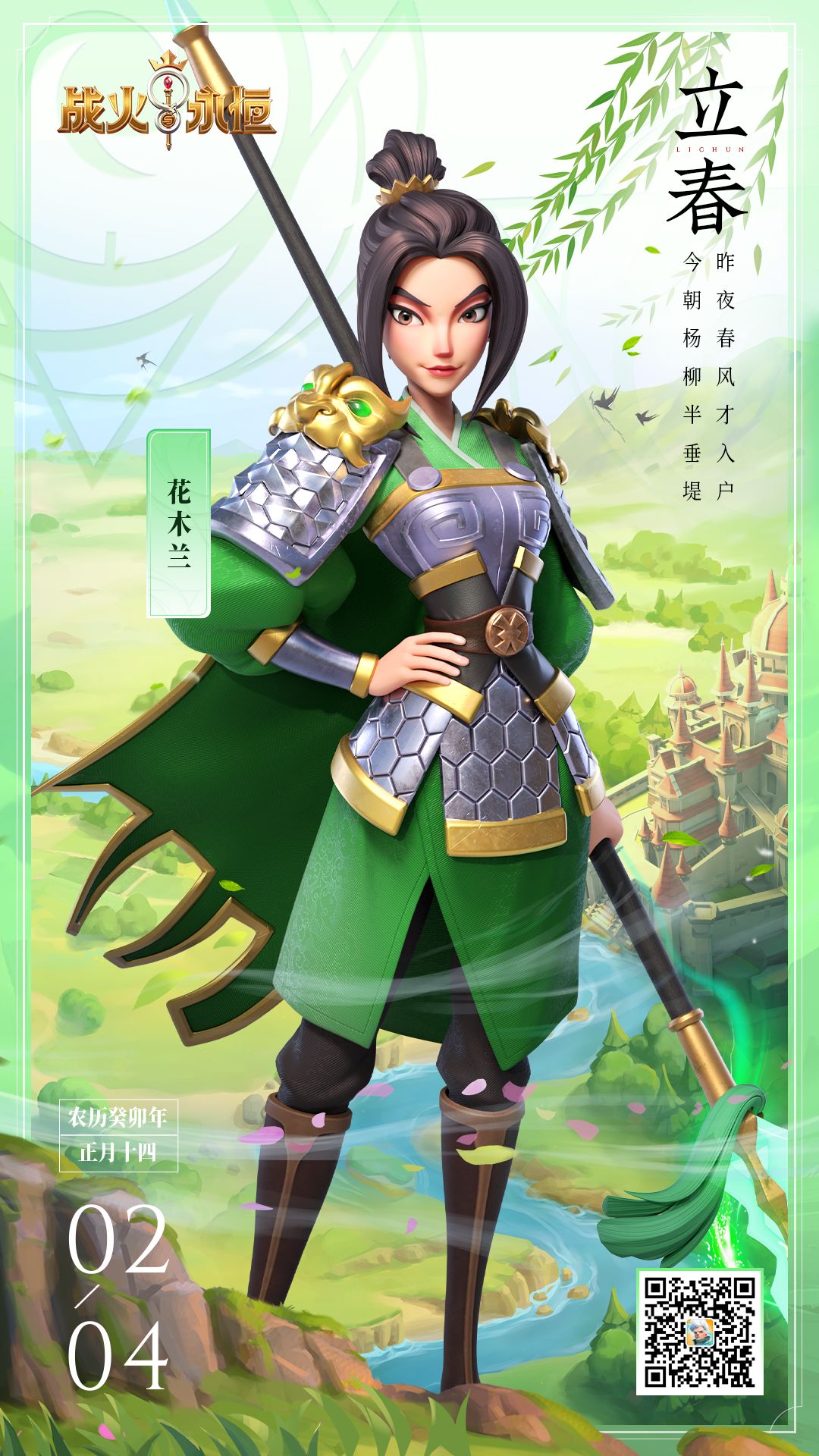 这次的节气专栏我们邀请到了巾帼英雄花木兰。隶属风元素阵营的她意气风发,身穿一身翠绿的戎装,手持镶有剔透绿宝石的长枪,斗篷轻轻拂动,仿佛有春风吹过。