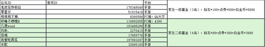 烹饪一级基金(3名):钻石*188+点券*588+白金币*5888