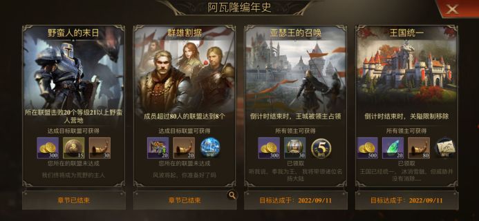 我个人更喜欢把阿瓦隆编年史当做成就任务来看待,完成指定目标,以获得对应的奖励。每期奖励不同,各位领主可以及时关注,并努力去完成目标。实现王国统一目标可以获得贤者之石,当然还会有其他的成就目标,领主们可以多关注一下对应章节的开启时间来获得自己想要的道具。
