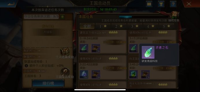 王国总动员成员完成任务会积累能量,能量满的时候可以获得发布次数,而我们可以根据自己的需求来完成任务,获得任务奖励。完成任务的同时,可以获得个人积分,个人积分达到6800的阶段可以获得贤者之石。王国排名越高,能获得贤者之石的数量越多。所以若个人积分不够,想要靠着王国排名来蹭奖励,也并不可取。