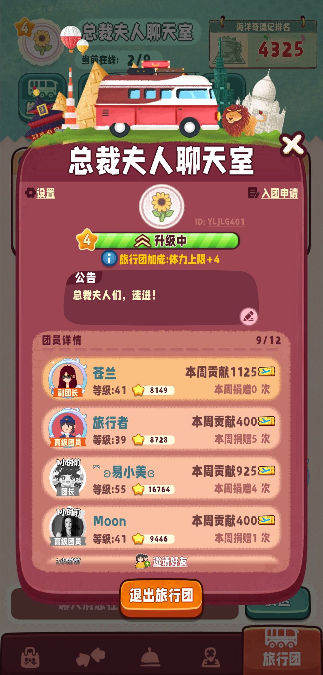 顺便为旅行团招一波人,4级旅行团,目前正在升5级。玩法休闲为主,除了