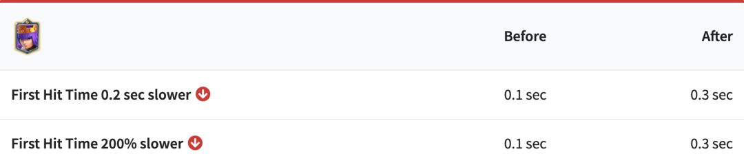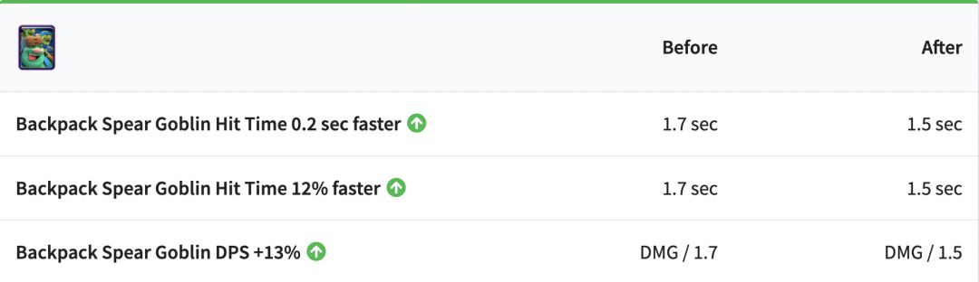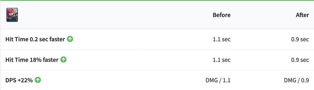 除去2.9速弩,你上一次见到弓箭手是什么时候?基本没有对吧?弓箭手是最早解锁的卡牌之一,等到玩家们解锁其他远程支援单位时——比如吹箭哥布林,就没人用了。为了让她们在环境里有自己的位置,我们决定加强其攻速,比之前快了18%。意味着她们的DPS增加了整整22%。