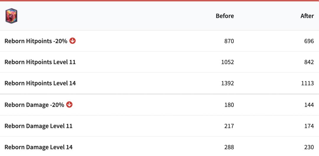 平衡性调整的常客,没想到经过这么多轮削弱后还是游戏中最强的卡之一。凤凰的基础数值不会变化,变化的是重生后凤凰的血量和伤害。调整后,重生的凤凰仅有原来凤凰80%的血量和伤害数值。重生形态的模型也有细微改变,比原来小了一圈。