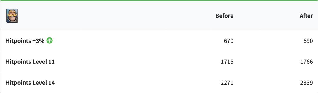 骑士最近的热度又下降了,总是被瓦基丽武神和皇家幽灵抢去风头。这次调整增加其3%的生命值。