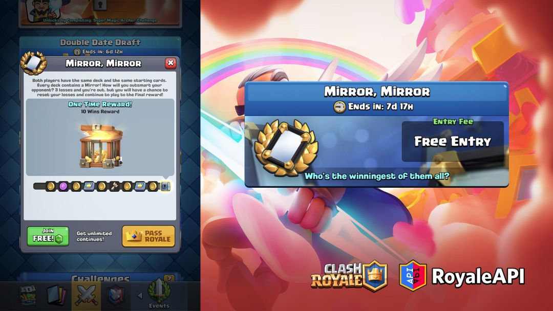 最公平的挑战回来了——双方都有相同的卡组和卡序,每套卡组一定有张镜像法术。标准挑战——3负出局。这个挑战有很多战旗币,不要错过。