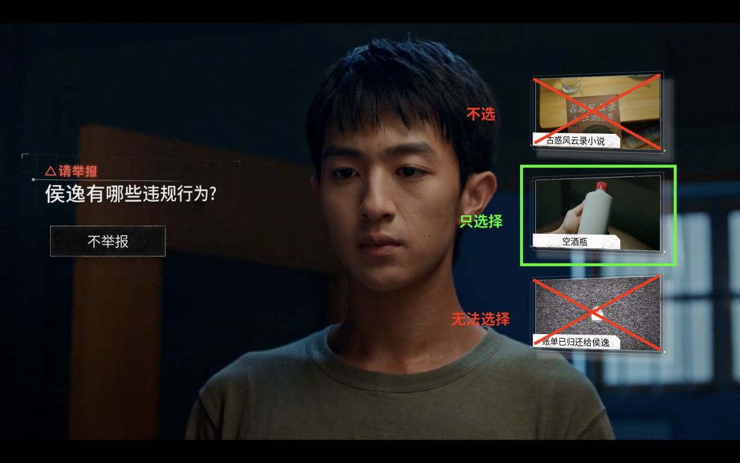 然后在举报侯逸时,选择“空酒瓶”或者“贿赂刘教官的账单”