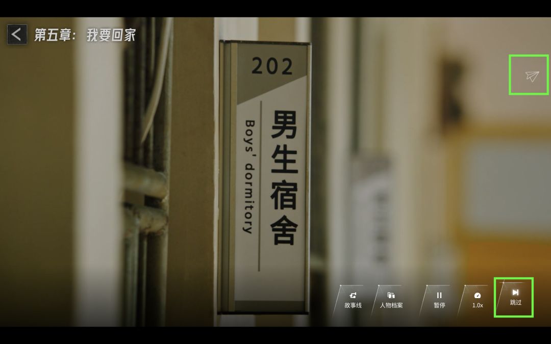 然后点击“跳过”剧情,直到右上角出现“纸飞机”存档图标:
