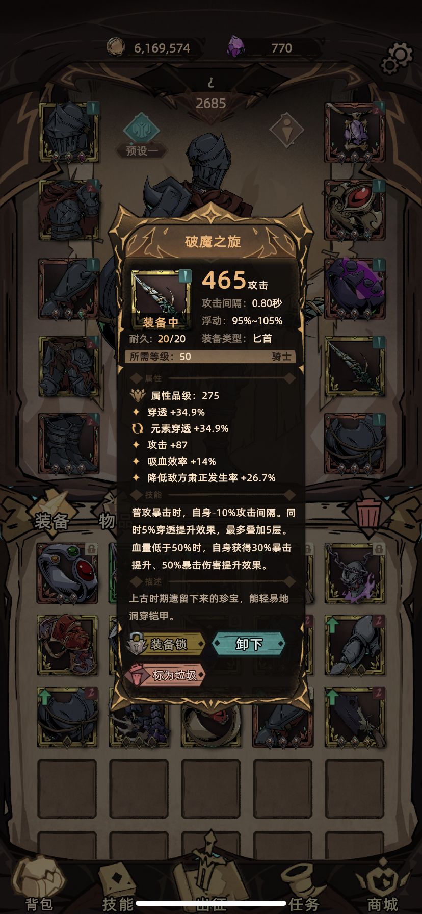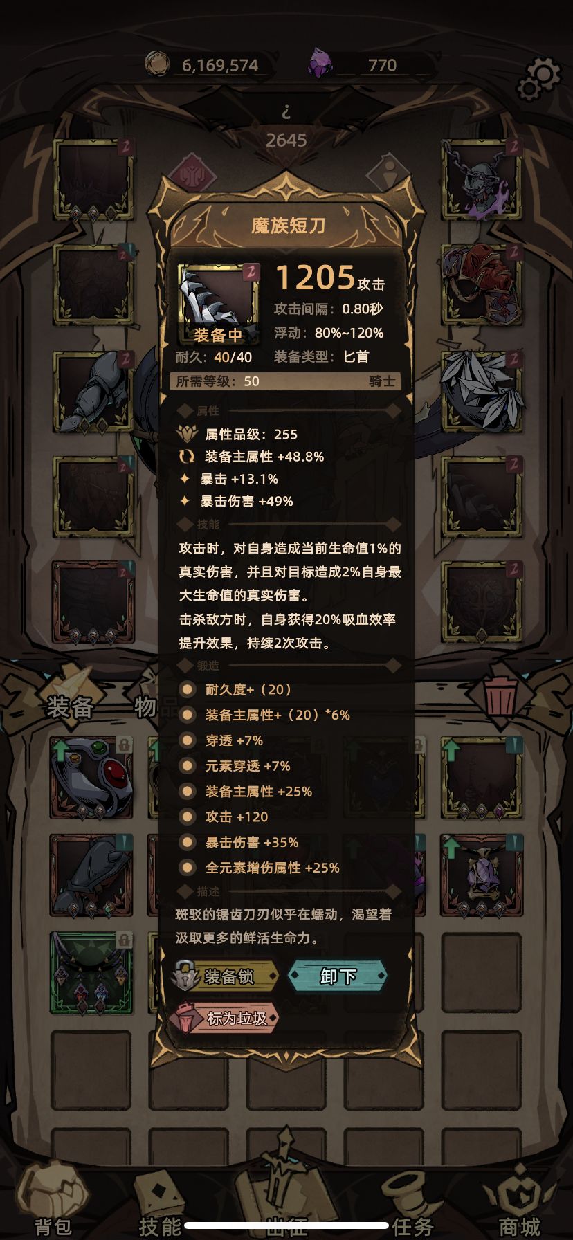 魔族短刀,刷图神器,提供15%暴击、50%暴伤,加速叠甲,打木桩时用来触发反伤
