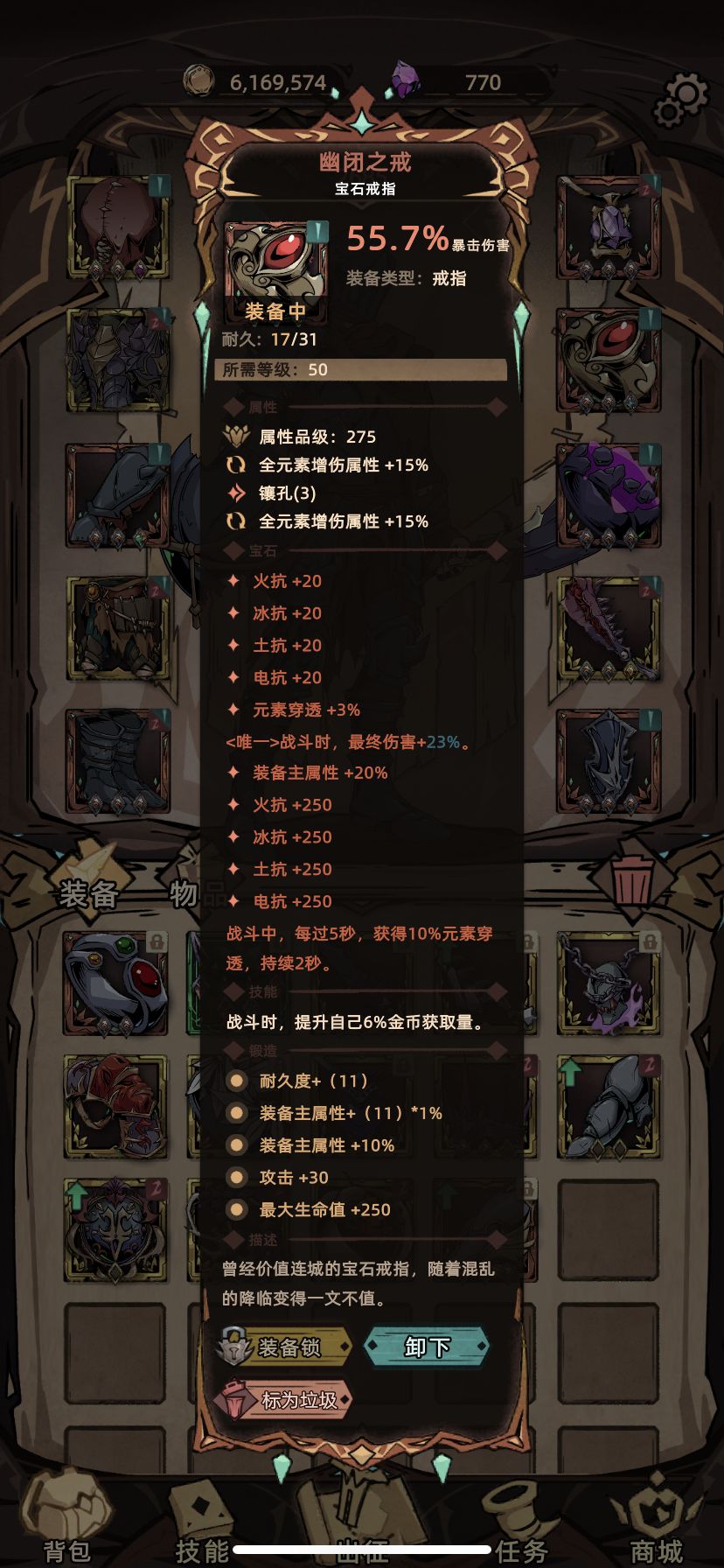 ⑤幽闭之戒,需要主属性土伤或暴击伤害,1孔或2孔可用,补充抗性、元素穿透