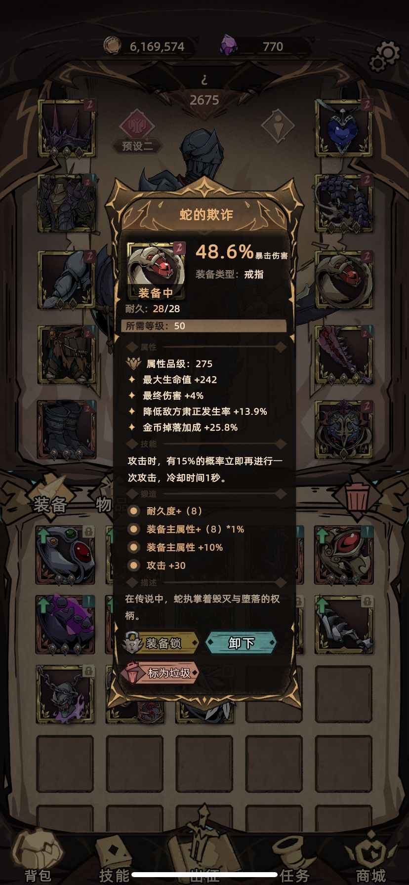 蛇戒,提供15%减肃正,5%终伤,主属性为土伤最佳,配合魔族短刀加速叠甲