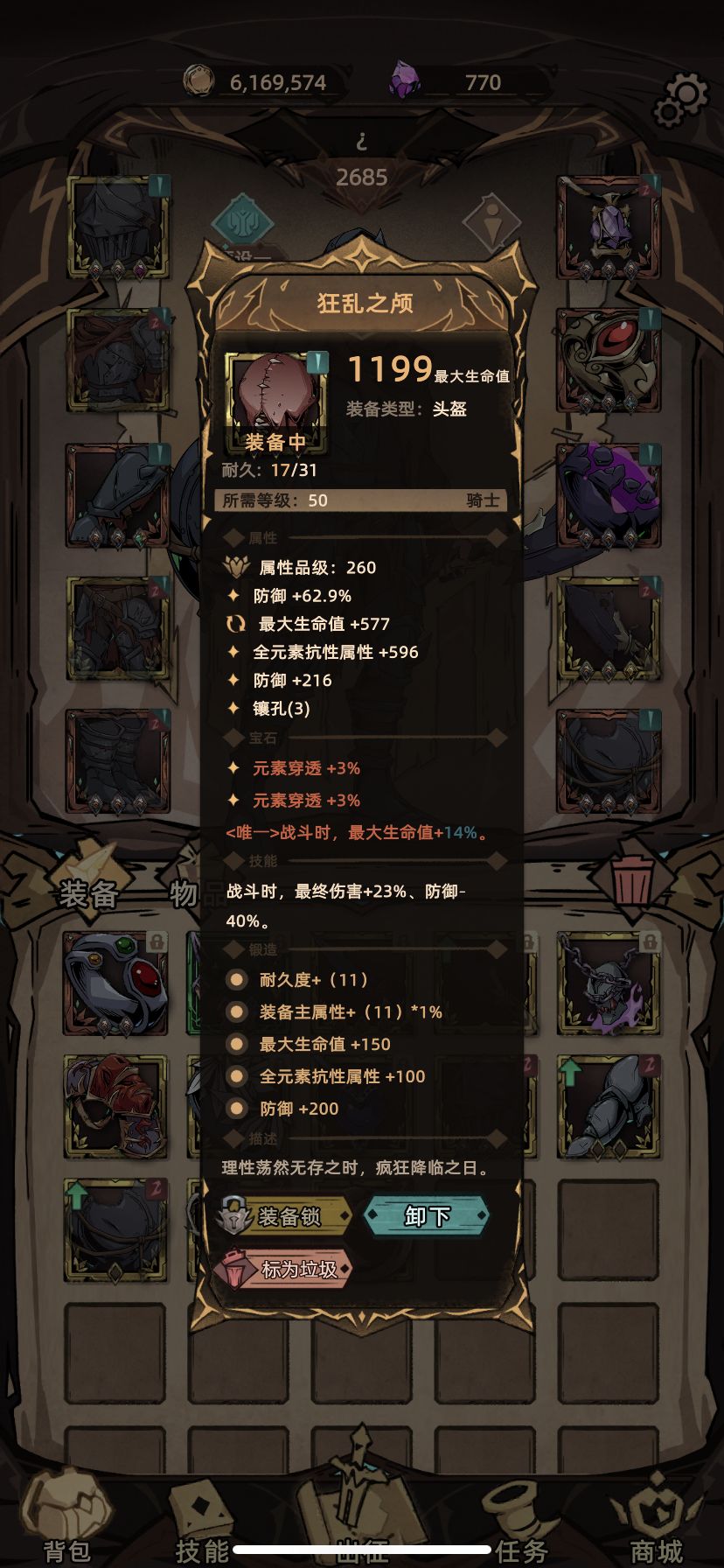 数值怪进阶的踏板,提供20%+防御、23%终伤、带孔,元素台一二技能没满时不如荆棘头好用
