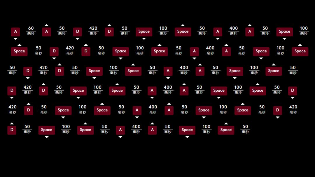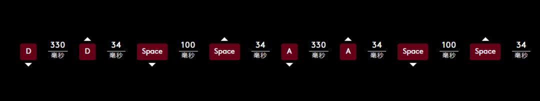 按住D → 间隔330毫秒 → 松开D → 间隔34毫秒 → 按住Space → 间隔100毫秒 → 松开Space → 间隔34毫秒 → 按住A → 间隔330毫秒 → 松开A →间隔34毫秒 → 按住Space → 间隔100毫秒 → 松开Space → 间隔34毫秒 → ((可根据自身需要,将以上流程复制若干遍后录入操作)).