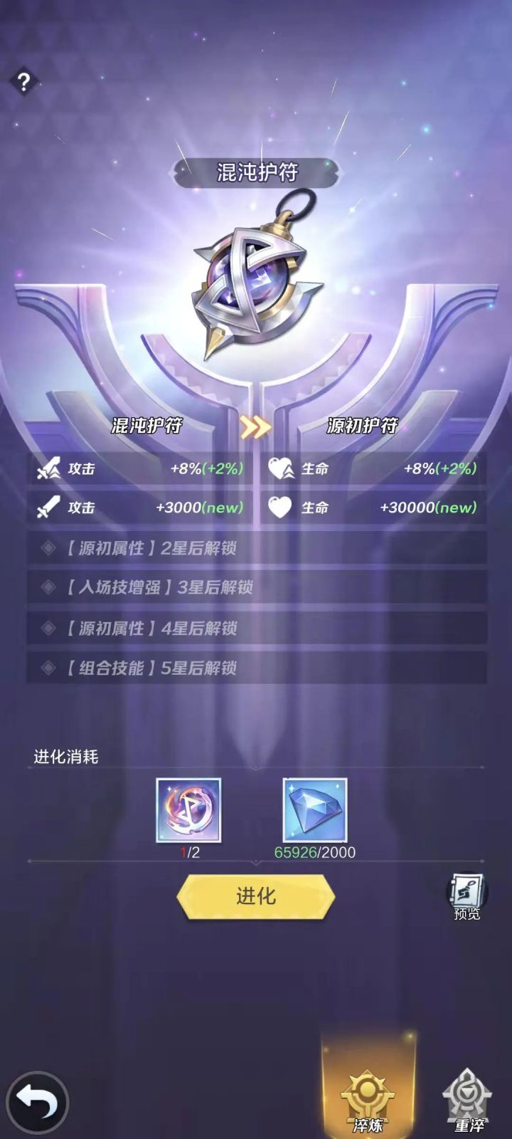 护符淬炼功能,在开服第22天与神域远征一起开启,红护符升级为源初护符需要2个【源生之火】和2000钻石,后续升级分别消耗2、3、3、5个源生之火。