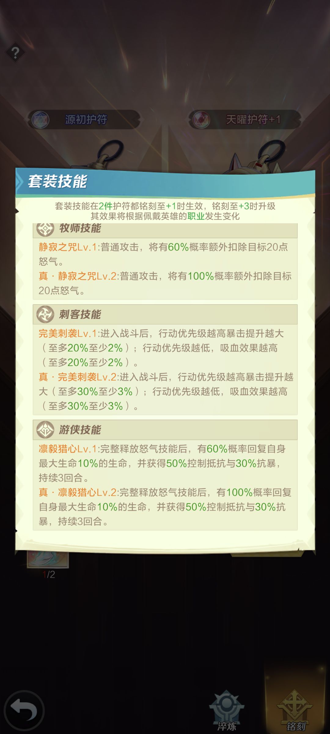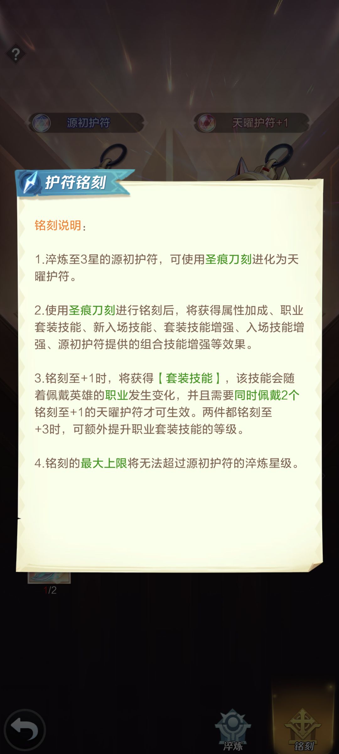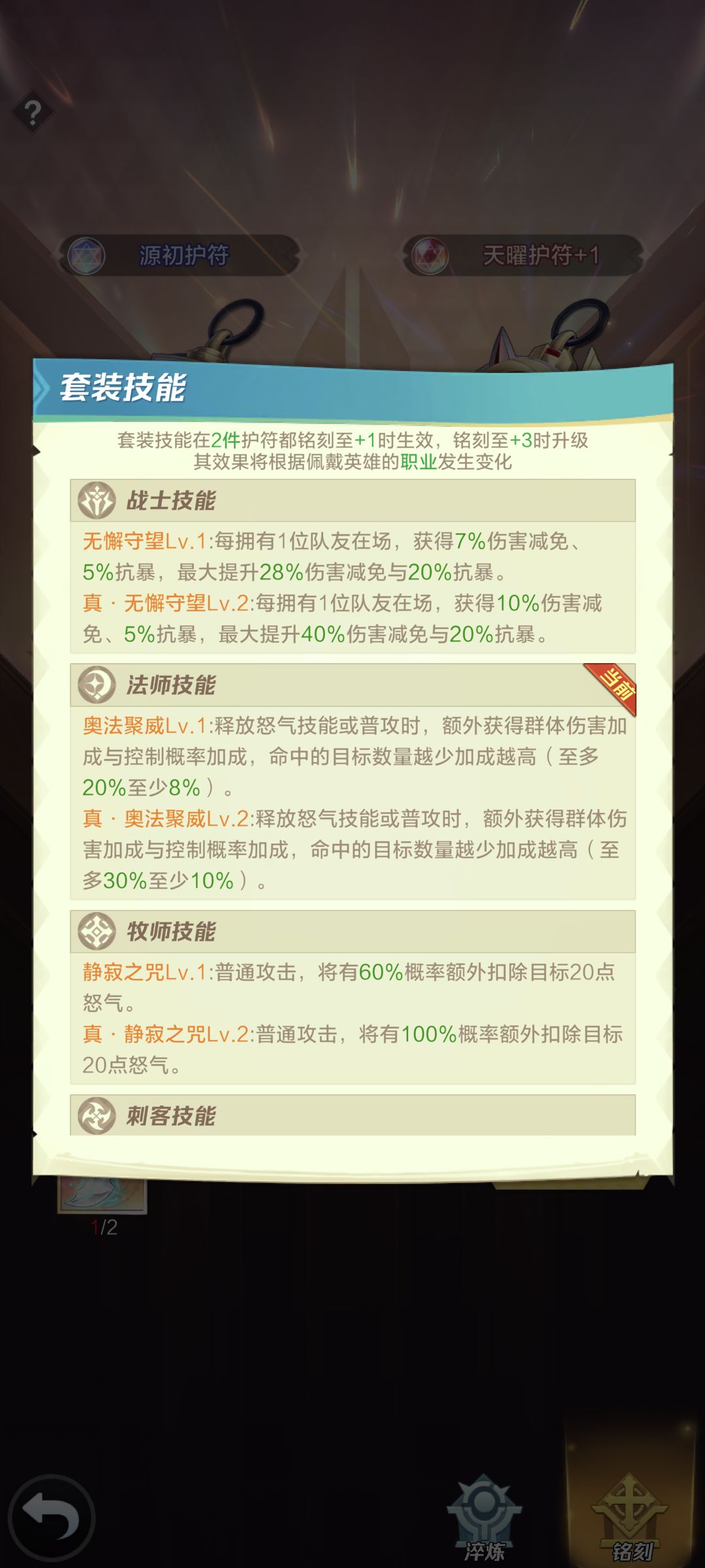 3星的源初护符开启,消耗【圣痕铭刻】升星,一三五星根据佩戴英雄的职业获得技能。