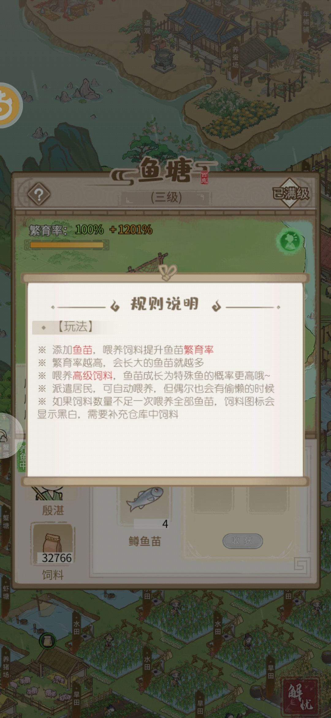 好不容易升到24级了,想着终于可以用面粉喂虾了,然后给虾塘升到了3级(?没记错的话),然后发现不能用面粉了,看了下升级介绍,发现可以用面粉喂虾这句话给去掉了,然后看建筑详情(),上面说用高级饲料可以增加特殊鱼的概率,然后就想换高级饲料,发现更换的界面没有高级饲料,然后我惊了,你居然把我高级饲料给吞了,然后查仓库发现高级饲料还在,再看了一下其他鸡鸭鱼什么的,高级饲料都不可以喂……