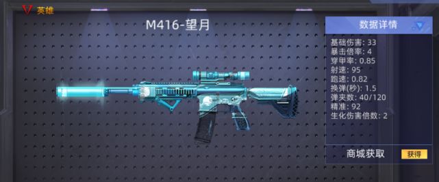 M416-望月:德国HK制造,挂载专属激光瞄准器和夜视仪,精度极高,虽然外形类似M4A1,实际工作原理不同,比M4A1更为可靠好用,深受各国特种兵的喜爱,基础上伤害:33、暴击倍率:4、穿甲率:0.85、射速:95、跑速:0,82、换弹(秒):1.5、弹夹数:40/120、精准:92、生化伤害倍率:2虽然从基础伤害和穿甲率上来看不如前面两把枪,但是该枪拥有超高的稳定性在对局中基本上不怎么需要压枪;外观造型上也是非常的帅气,暴击击杀对手时备用弹夹子弹数+1,重型枪管发出的子弹可以穿透防弹衣