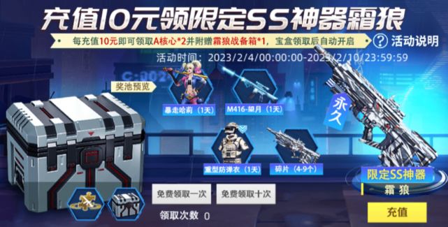 今天小白为大家来详细解析一下这次10元充值领取ss级武器霜狼的活动(活动时间2023年2月4日到2023年2月10日)每充值10元就可以领取A级核心*2加霜狼战备箱*1,领取到之后宝箱会自动开启。霜狼战备箱内奖励包含(霜狼、望月-M416、重型防弹衣、暴走哈莉、可合成碎片)