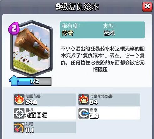 这是一张法术卡,而且所需的费用非常低,仅仅只需2费。这张卡可以秒杀骷髅海,哥布林团伙以及公主等。不仅伤害比较高而且还能有击退的效果,虽然不能对天空,但只要是地面上的,谁都没有办法幸免。这张卡最大的用途就是为强力单位保驾护航,清除地面障碍,性价比非常高。