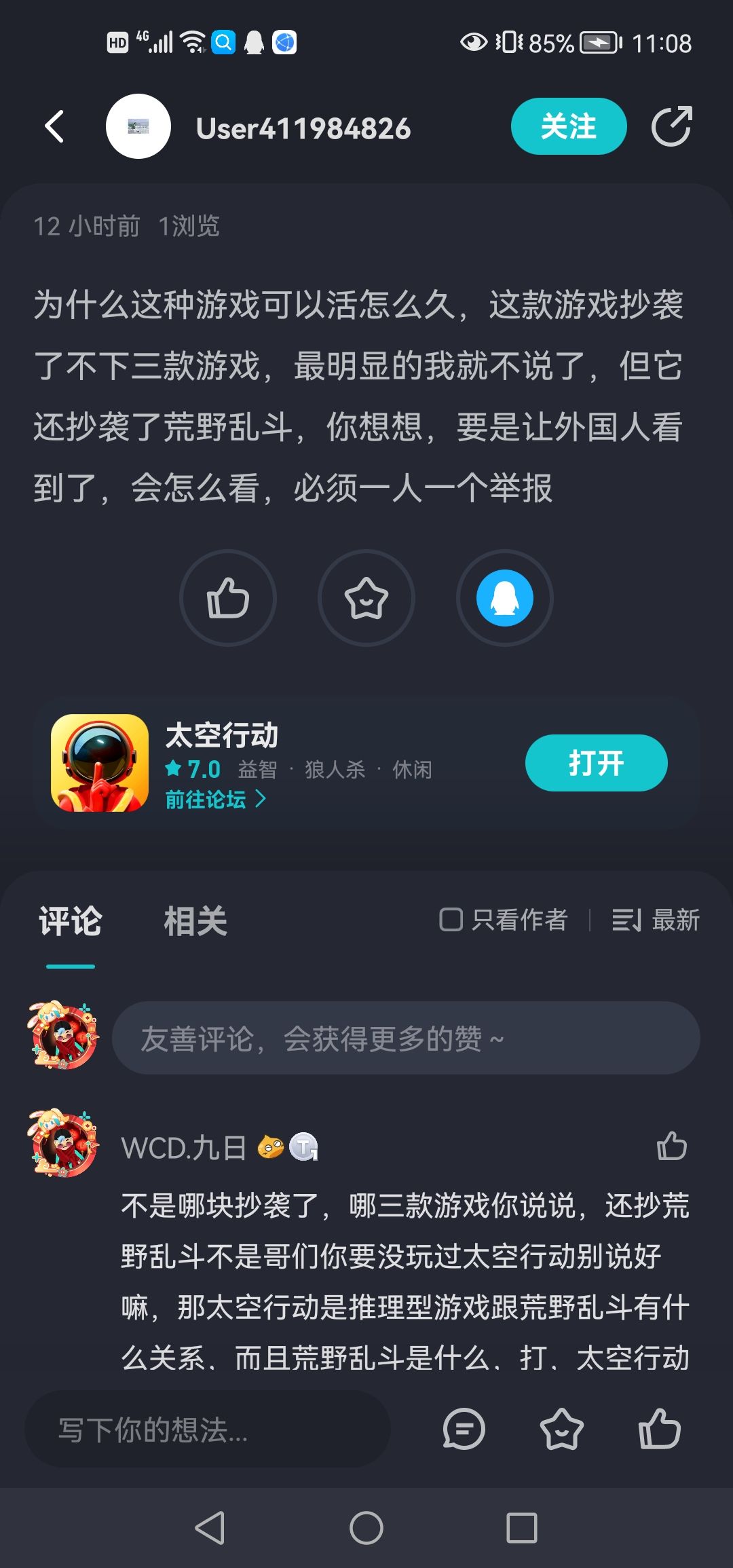 我正在逛论团了,就看见一个这个帖子,我就说无语了,太空行动啥时候抄袭了,这个作者还说抄袭荒野乱斗,真无语,下面原图