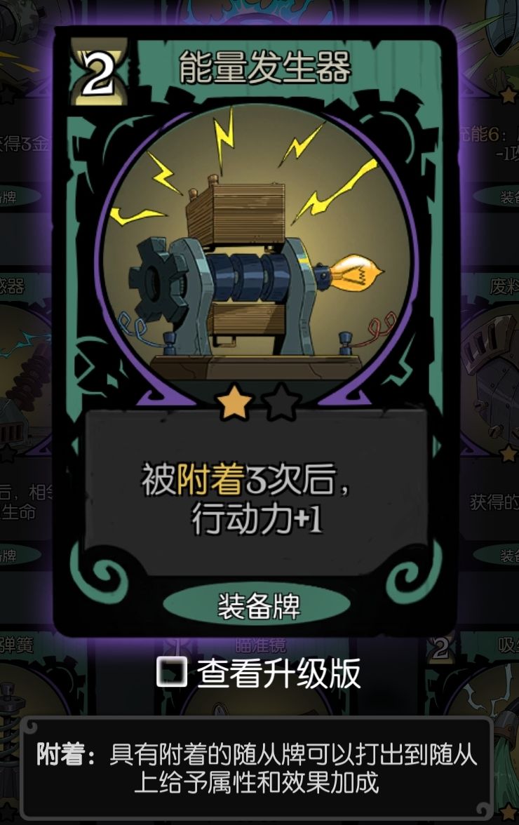 关键装备:能量发生器“被附着3次后,行动力+1”,附着牌太多,需要很多行动力